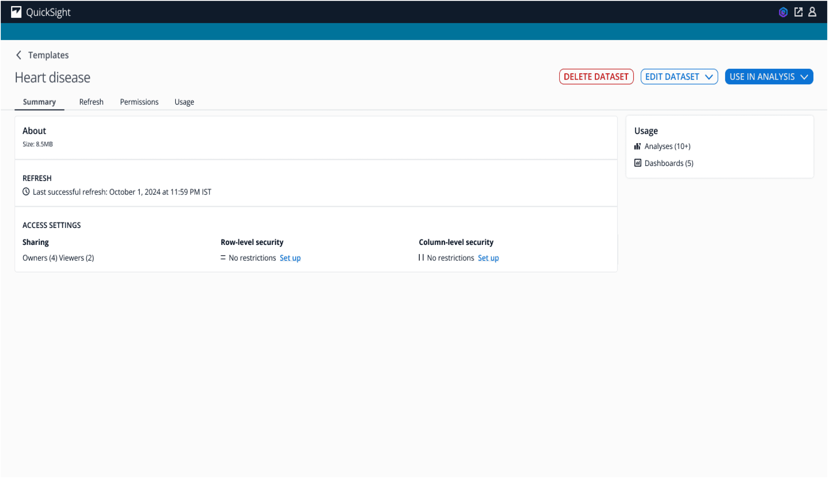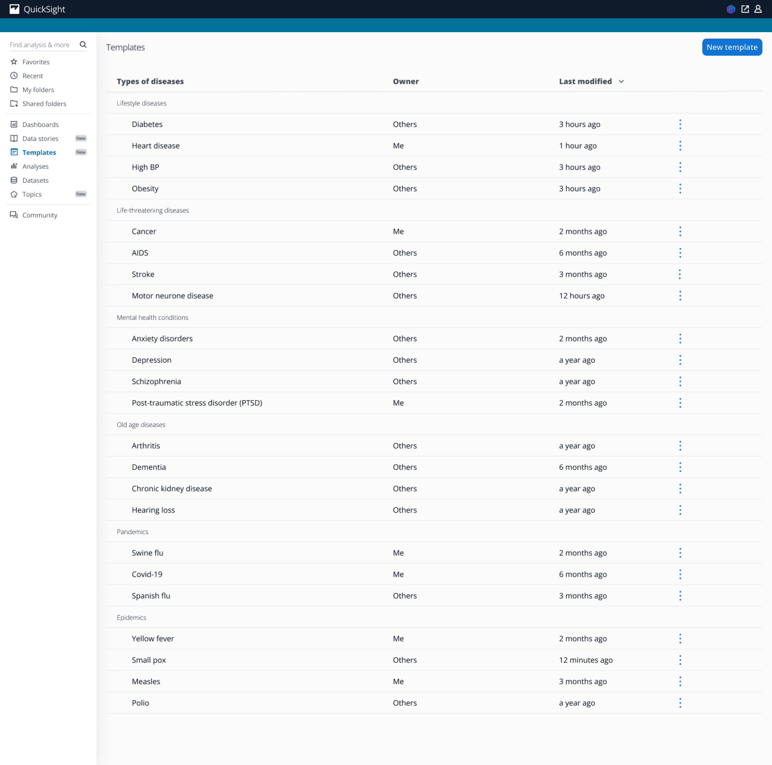 In the QuickSight console, there will be an addition of templates section wherein there will be a table which has the types of diseases displayed like lifestyle diseases, old age diseases, etc which will be bifurcated further into their sub-types.
