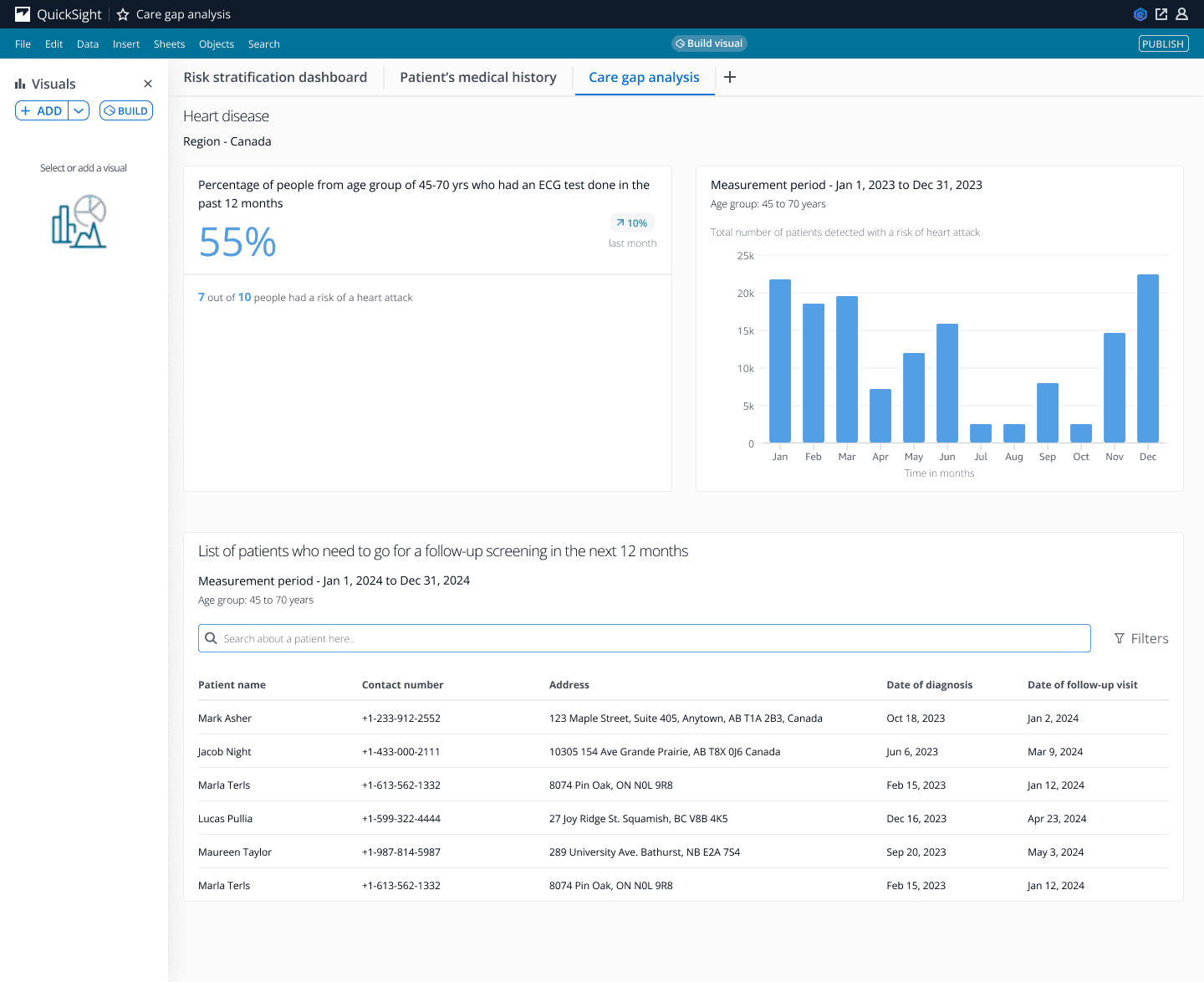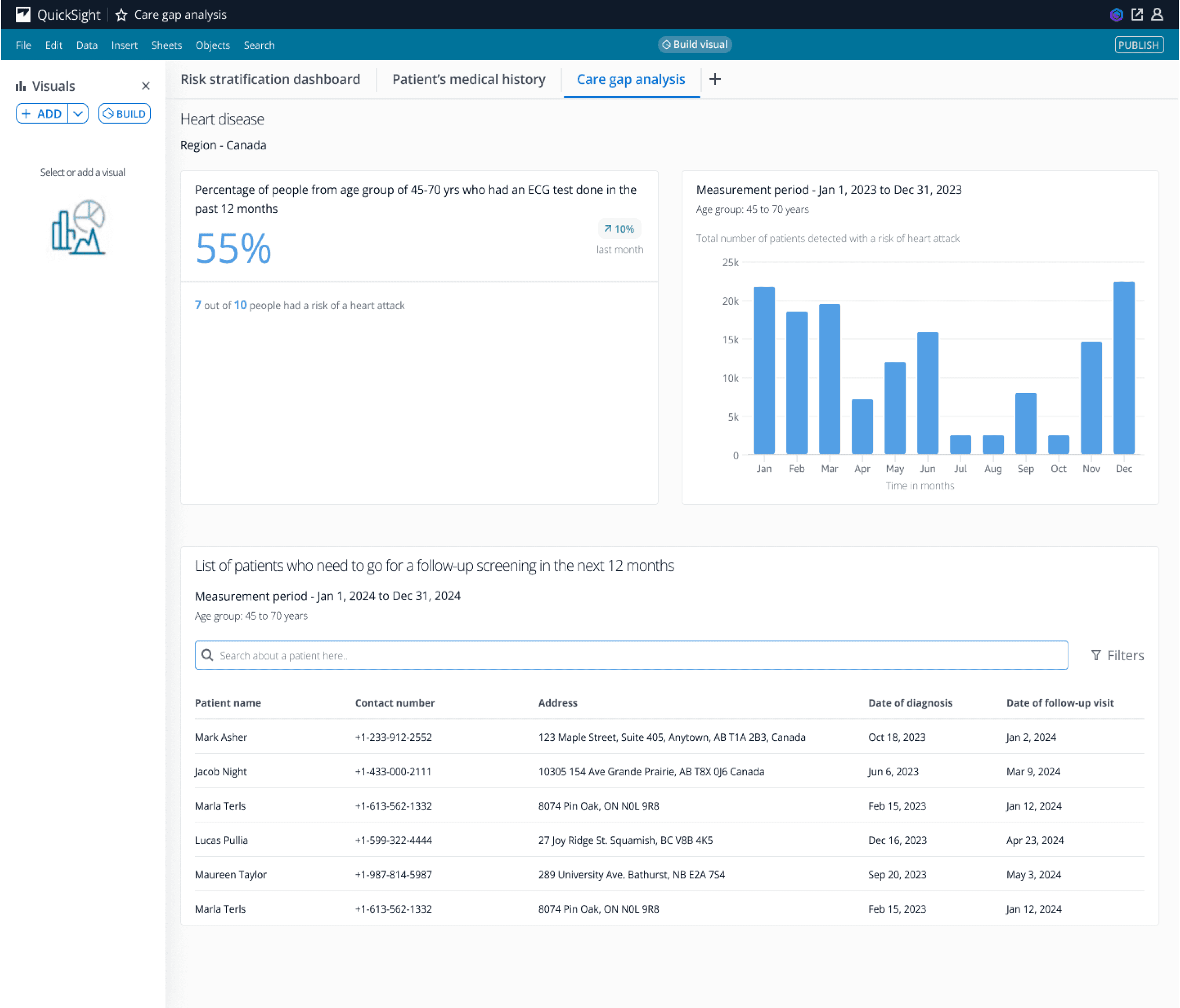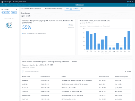 This section will have info like the % age of people who had an ECG in the past 12 months, a bar graph which shows the total number of patients which have the risk of a heart attack and also a table showing the list of patients who need to go for a follow-up screening in the next 12 months.